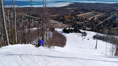 Winter in Ontario really is long, I started skiing at Blue in late November and probably had my last day on the hill April 4....6 calendar month of the lifts turning. Conditions we groomed and hard after a -6C night. The Sun was out and the temps warmed to around the freezing mark when I hit the slopes.